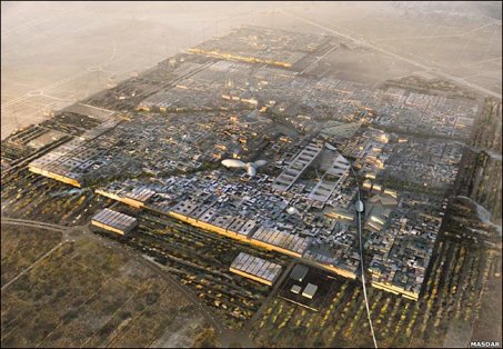 Depuis février 2008, Masdar, une ville écologique en carré émerge du désert, sur une superficie de 600 hectares, à 30 kilomètres de Abu Dhabi. Masdar, signifiant "source", se veut laboratoire mondial des énergies renouvelables : 100% écologique, auto-suffisante en énergie, en ressource, et ultra-futuriste.